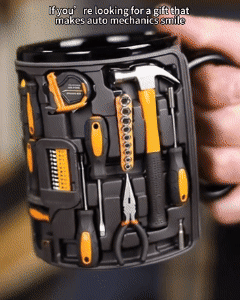 Unohda tylsät ja yksinkertaiset kupit, joista puuttuu persoonallisuus. Realistinen työkalupakin muotoilu kunnioittaa hänen kovaa työtään, jolloin hänen aamukahvinsa tuntuu ansaitulta palkinnolta.