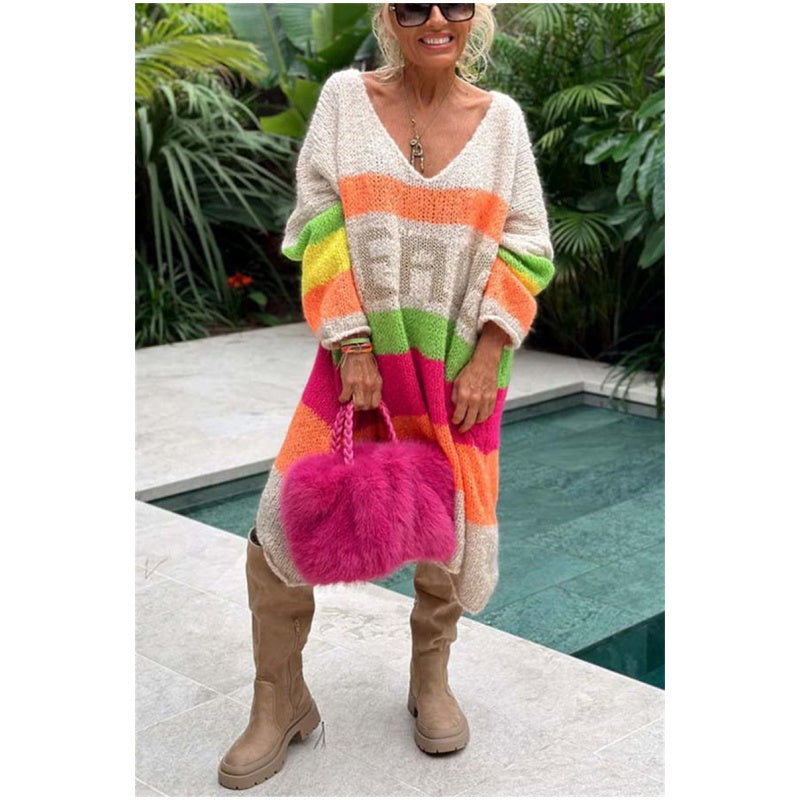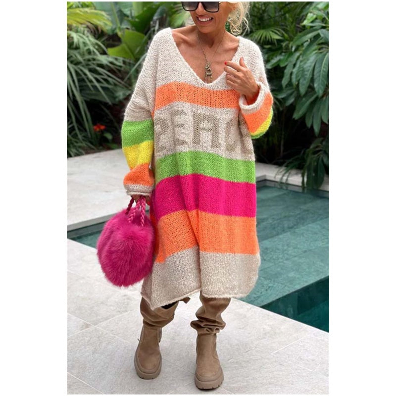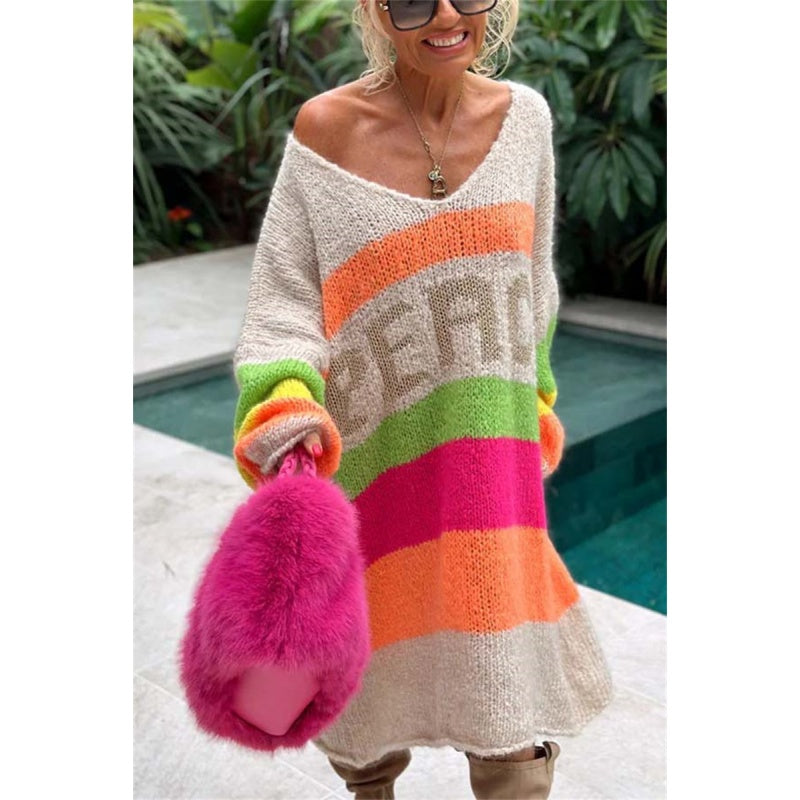 Package Includes: 1* Color Block V-Neck Letter Print Sweater Dress