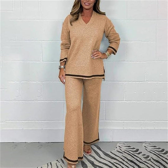 FASHION DESIGN: The set includes a chic V-neck top with a side-slit hem, paired with matching wide-leg pants, suitable for all body types and a versatile choice for any occasion.