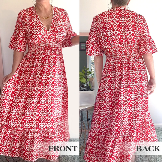 Designed with a V-neckline and a relaxed bust, this dress offers a comfortable and flattering fit. The lightweight fabric adds to its airy feel, making it your go-to choice for breezy days and nights.