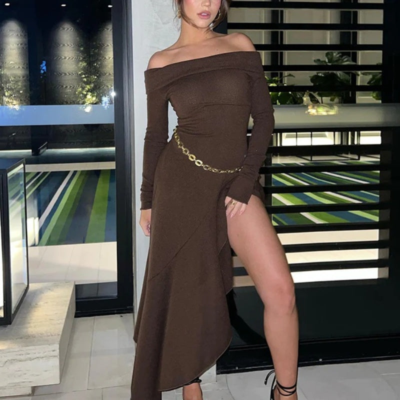 FASHION DETAILS - Stylish off the shoulder design, long sleeves for added coverage and warmth, ruffle Irregular hemline for a modern and unique look, solid color, maxi length.