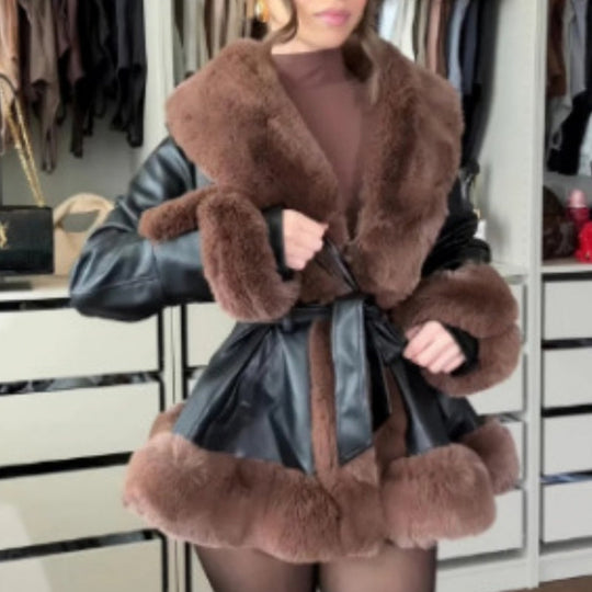 CHIC DESIGN: This coat combines sleek faux leather with a soft faux fur collar, creating a look that’s both edgy and elegant. Perfect for winter warmth without compromising on style.