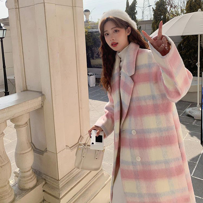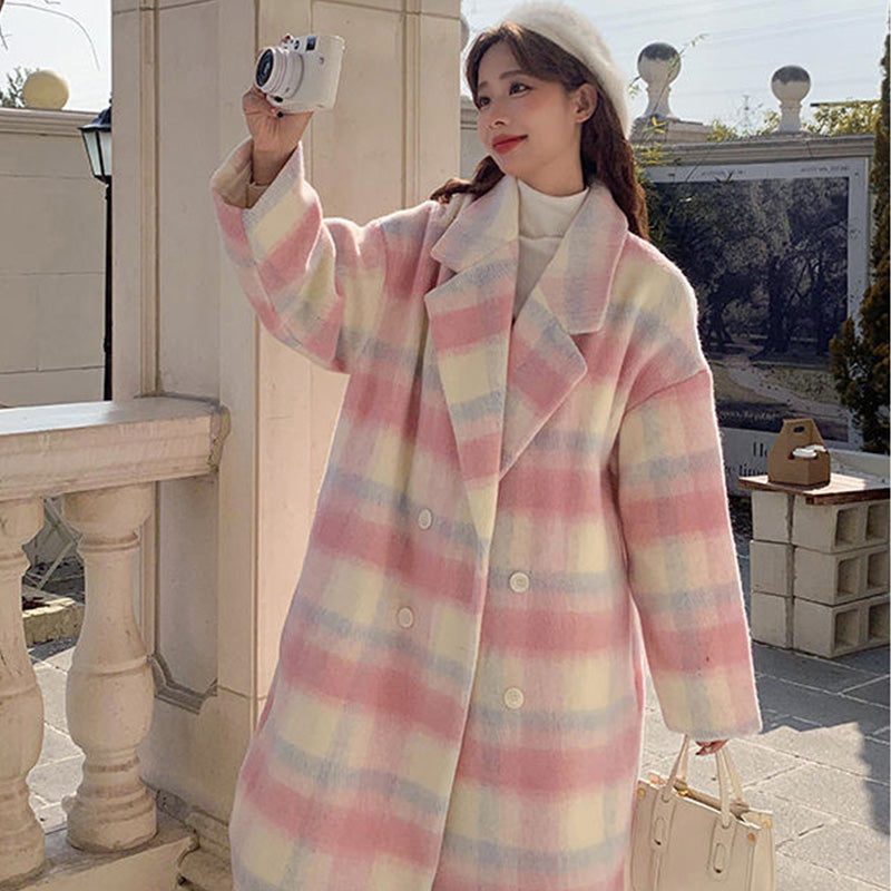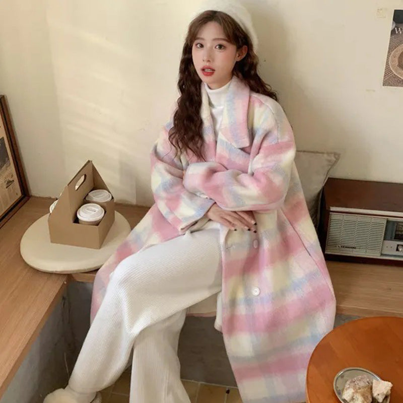 1 * Kadın Ekose Sentetik Yün Bol Kesim Uzun Palto